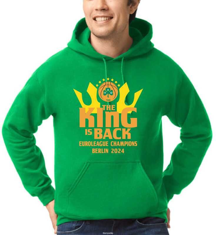 Φούτερ με κουκούλα green Παναθηναϊκού με στάμπα "The King Is Back" EuroLeague Champions Berlin 2024. Ιδανικό για τους φανατικούς οπαδούς του Παναθηναϊκού και της EuroLeague.