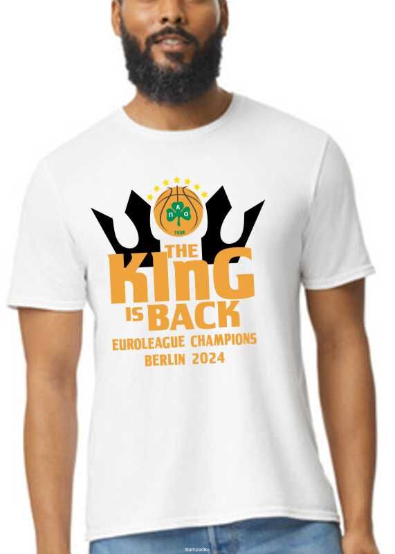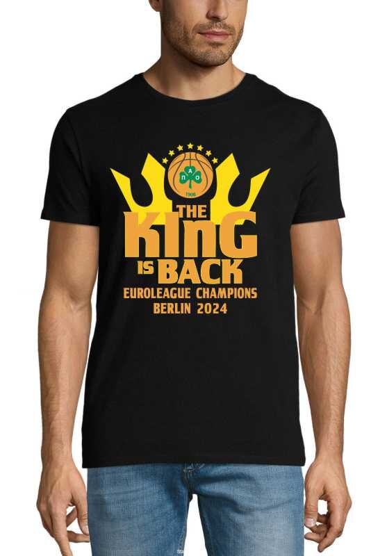 Αναδείξτε την αγάπη σας για τον Παναθηναϊκό με αυτή τη μοναδική μπλούζα t-shirt "The King Is Back". Ένα must-have για κάθε οπαδό, αφιερωμένο στη μεγάλη νίκη στο EuroLeague Final Berlin 2024!